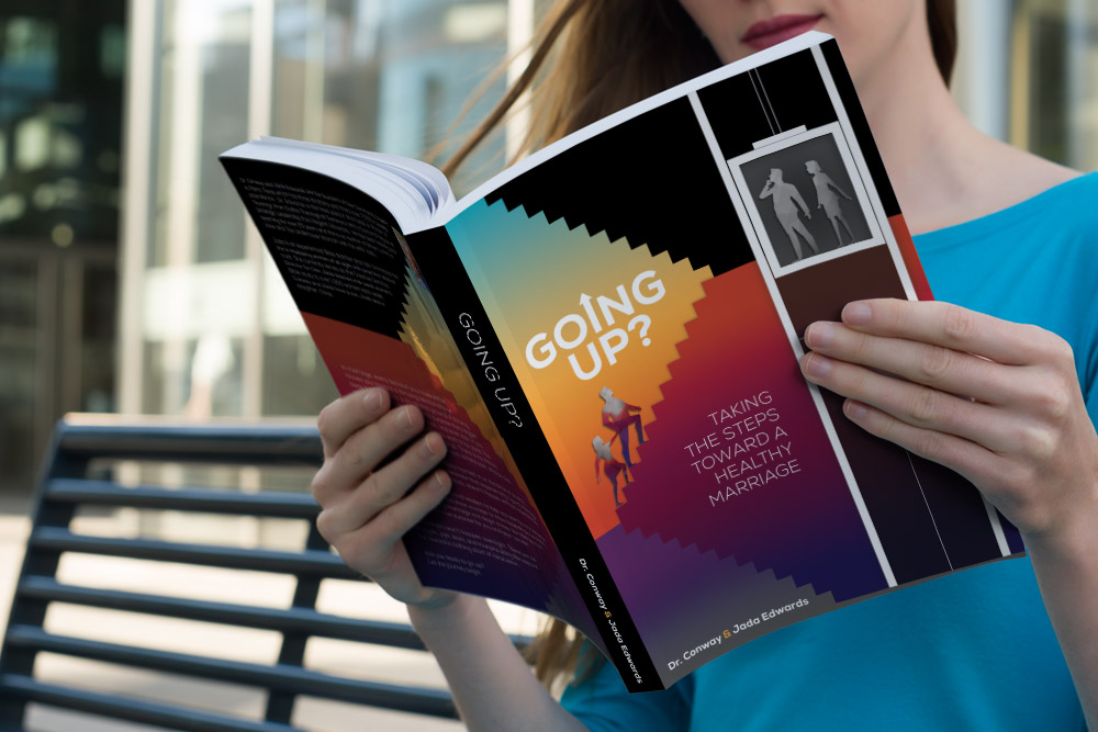 Book cover created for Dr. Conway and Jada Edwards for their latest book on relationships Going Up?. They wanted something to show the importance of doing the work together – taking the stairs instead of the elevator. So I used color to show the journey and how it changed them if they took the hard way together. The colors become a part of the couple on the stairs as they climb. They hold hands to support each other in the climb, but also because the journey brings them closer together. The couple in the elevator remain gray. They may appear they are farther ahead but they missed the opportunity to grow and connect by trying to skip the challenges the stairs would bring. The client was extremely pleased.